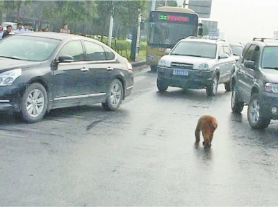 記者隨后致電鄭州市林業(yè)局野生動(dòng)物救護(hù)站求助。在等待的過(guò)程中,這只“美猴王”引來(lái)不少市民圍觀,有市民拿出手機(jī)靠近拍照,“美猴王”猛地躥出,嚇得拍照的市民連退幾步。見(jiàn)人群漸多,“美猴王”坐不住了,跑到了商都路的快車(chē)道上,過(guò)往車(chē)輛見(jiàn)狀紛紛躲避(如圖),幾位巡防隊(duì)員在后面跟著,提醒車(chē)輛注意,但跟得緊了,“美猴王”還一度回過(guò)身來(lái),試圖撲咬巡防隊(duì)員。