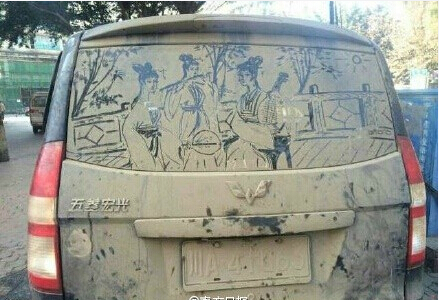 網(wǎng)友在成都偶遇一臟不溜秋的面包車(chē)!走近一看,后檔風(fēng)玻璃上畫(huà)了一副美女圖,惟妙惟肖!~你只覺(jué)得我沒(méi)錢(qián)洗車(chē),卻不知道我也有一顆藝術(shù)的心~~只是朋友,車(chē)牌被擋住了,等會(huì)兒警察蜀黍過(guò)來(lái)……