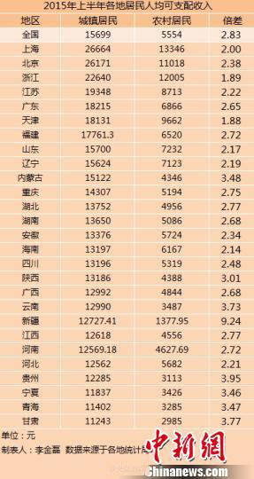 近日,全國各省份2015年上半年居民收入數(shù)據(jù)陸續(xù)出爐。27個省份中,城鎮(zhèn)居民①上海最高,26664元;②北京26171元;③浙江22640元。農(nóng)村居民①上海最高,13346元;②浙江12005元;③北京11018元。你那情況如何?