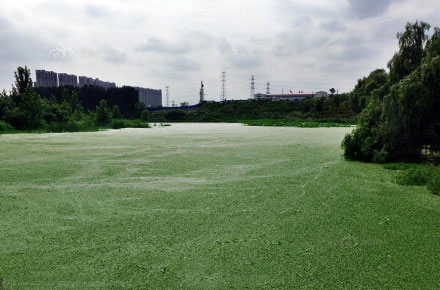 這不是草地,這是西流湖。近段時(shí)間,鄭州西流湖多次遭受污染,除了湖面瘋長的浮萍外,大量死魚還漂浮在湖面上。