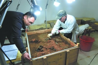 徐長青所說的實驗室即文物保護(hù)用房,距離南昌西漢?;韬钅共坏?公里。這不到1公里的轉(zhuǎn)運道路,部分為鄉(xiāng)間土路,加之最近接連幾天下雨,道路已 凹凸不平。據(jù)了解,打包好的主棺柩總重量超過4噸,錢箱有2噸多重。如果路面不平,將會給轉(zhuǎn)運帶來不確定因素。為了確保轉(zhuǎn)運當(dāng)天運輸通暢,避免文物顛簸晃 動,工作人員這幾天運來了大量砂石填平道路。14日上午,整條運輸線上的坑洼路段已全部填平完畢。