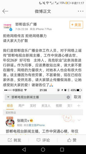 微博上暈倒的女主播為《邯鄲新聞》主播,在主持當(dāng)?shù)匾豁?xiàng)發(fā)布活動(dòng)時(shí)因勞累而暈倒在地,并被網(wǎng)友拍了視頻發(fā)在網(wǎng)上,稱(chēng)其猝死。為此,彤彤特意發(fā)了一條朋友圈來(lái)辟謠,提醒大家不要傳謠以免給本人造成傷害。