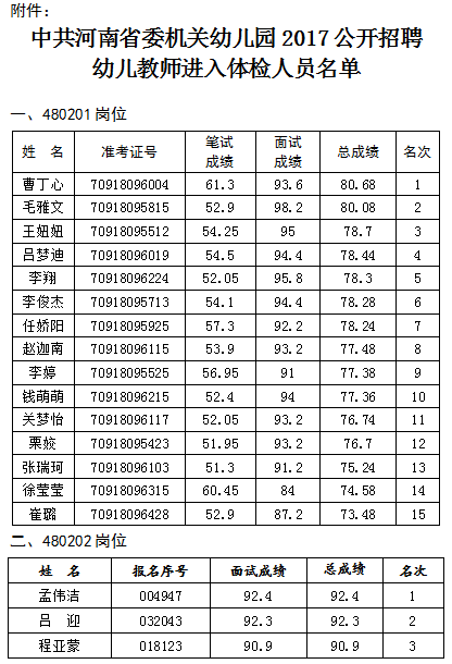 中共河南省委機關(guān)幼兒園2017年公開招聘幼兒教師面試工作已經(jīng)結(jié)束。根據(jù)總成績排名,按照招聘人數(shù)與體檢人數(shù)1:1的比例,確定480201崗位15名考生進入體檢環(huán)節(jié),480202崗位3名考生進入體檢環(huán)節(jié)。