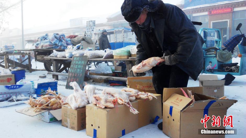 呼倫貝爾市圖里河鎮(zhèn)菜市場,當(dāng)日圖里河鎮(zhèn)最低氣溫達(dá)-42℃。 圖片來源:視覺中國
