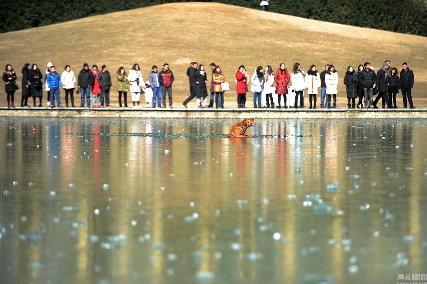 2016年1月25日中午12時30分許,安徽合肥市民項(xiàng)先生正好在賴少其藝術(shù)館附近辦事,突然他發(fā)現(xiàn)一只大金毛被卡在藝術(shù)館門口的冰面中,一直在掙扎。