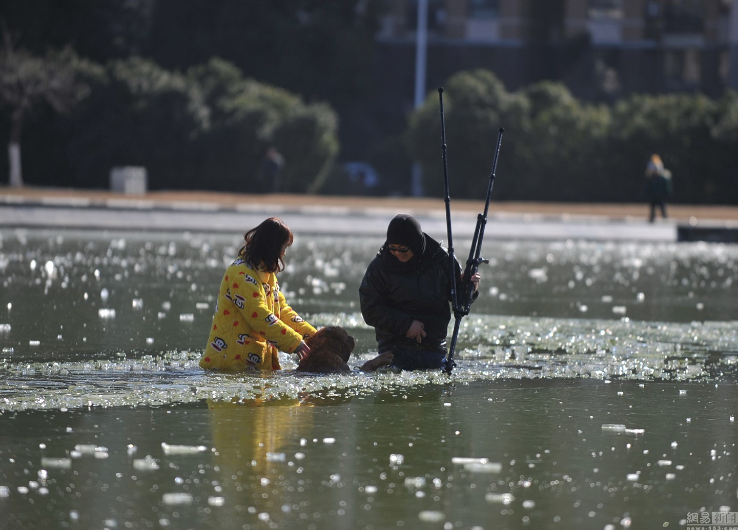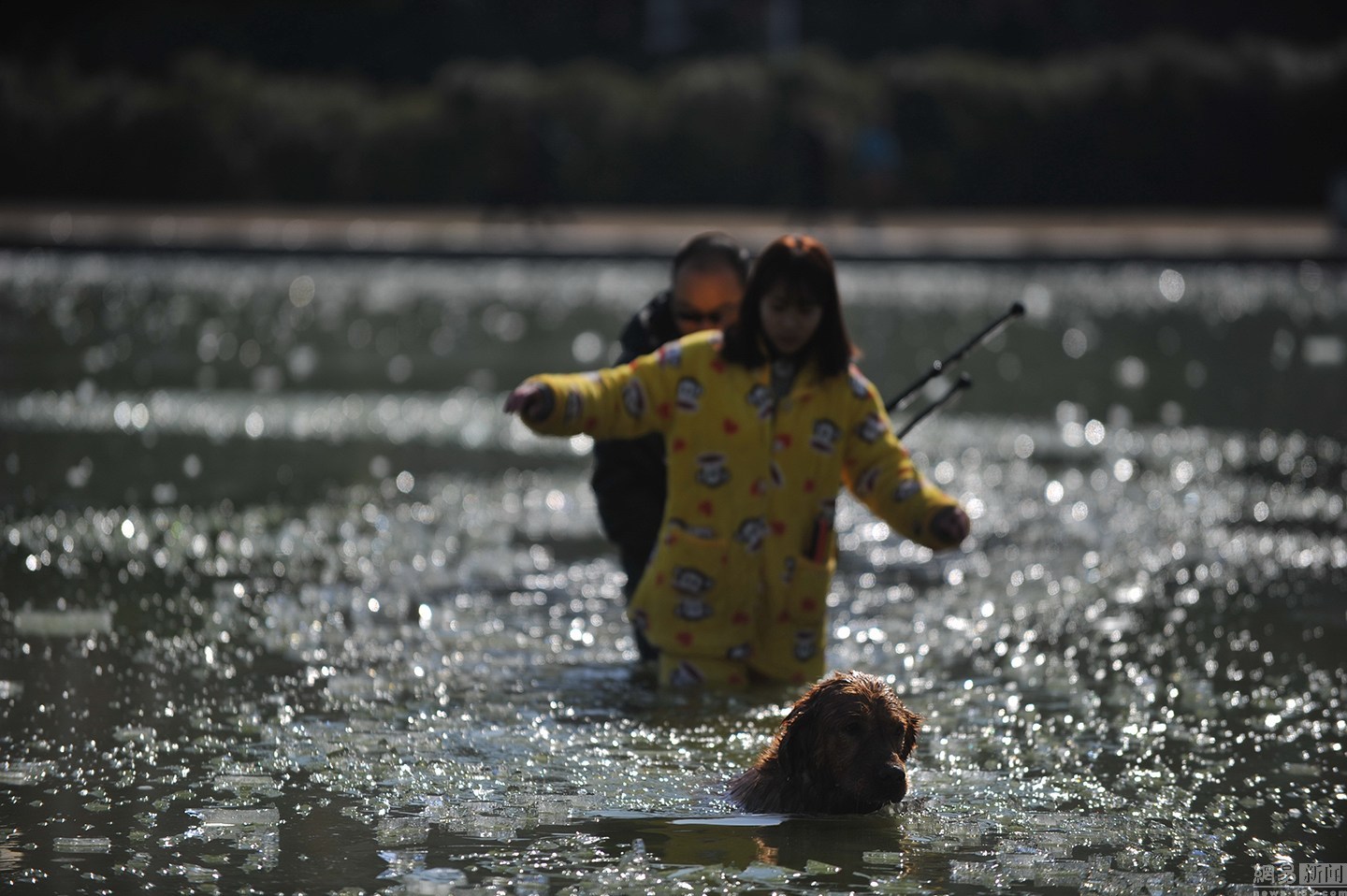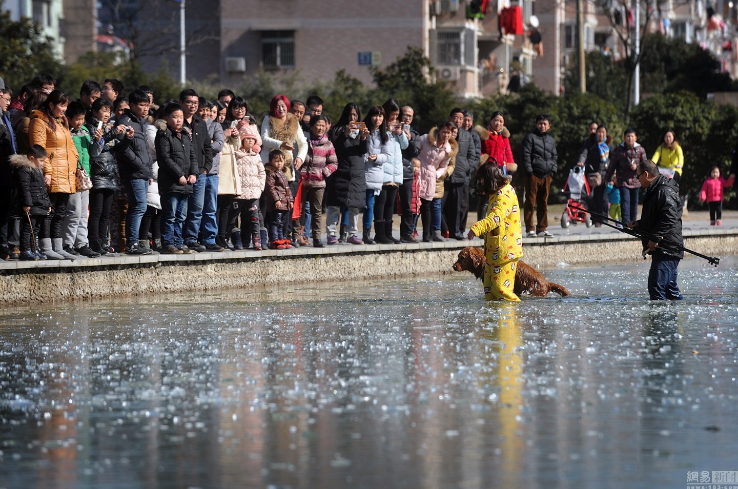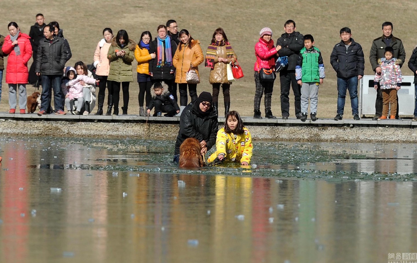 “我知道這水不深,自己又會游泳。”面對冰冷的水面,項(xiàng)先生并沒有多想,只想趕緊救出狗狗。圖為兩人合力救金毛現(xiàn)場。