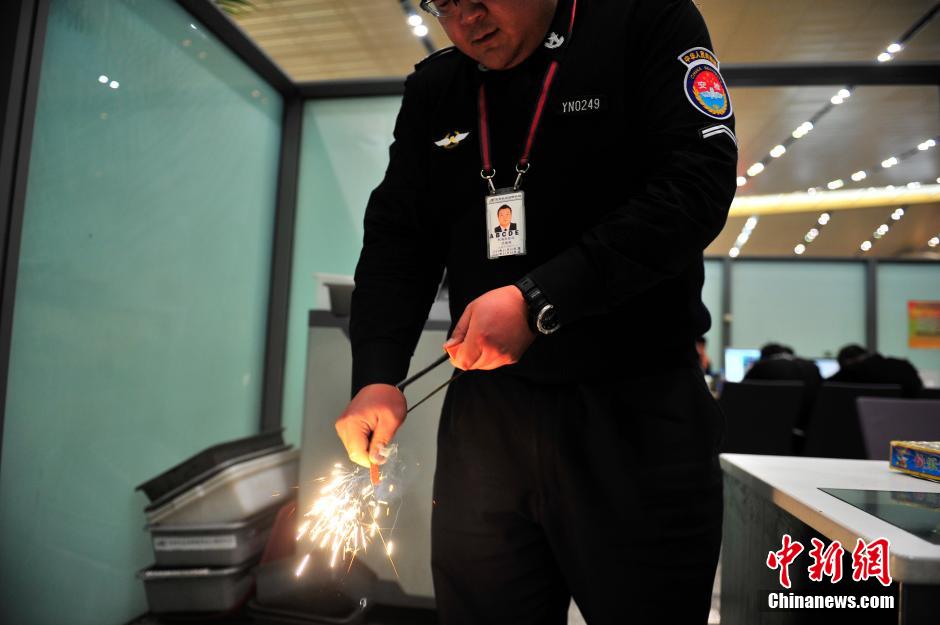 2月5日,昆明長水國際機(jī)場安檢站工作人員,向記者展示春運(yùn)開始以來查獲的如皮帶扣打火機(jī)、iPhone造型打火機(jī)、手表打火機(jī)、煙花爆竹、子彈等各種奇葩違禁物品。中新社記者 劉冉陽 攝