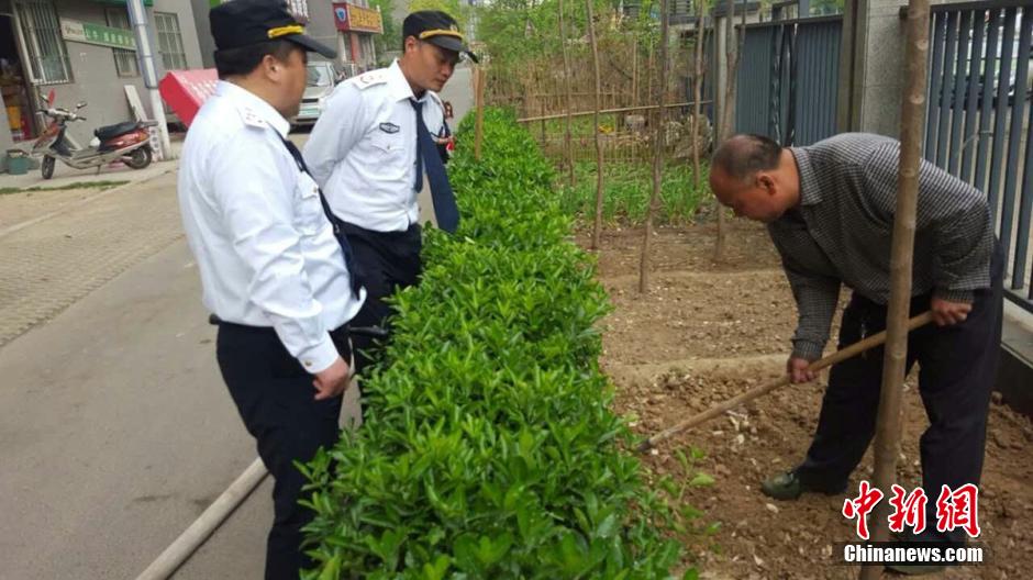 4月5日上午9時(shí)許,未來路街道巡防隊(duì)員司廣紅、盧龍等三人巡邏中發(fā)現(xiàn)一件奇葩事:有一根消防管從燕莊新區(qū)南院9號(hào)樓北面的20樓一家住戶窗口被放下,水管的另一頭直通小區(qū)柵欄里的小菜園。鄭州市燕莊村一村民住上了高樓,卻仍然放不下種地種菜。把小區(qū)垃圾清理出來,開墾出一片小菜園,又從20層的高樓往下放水澆菜。這種菜的成本遠(yuǎn)高于買菜,但他卻樂在其中。李四信 攝 圖片來源:視覺中國(guó)