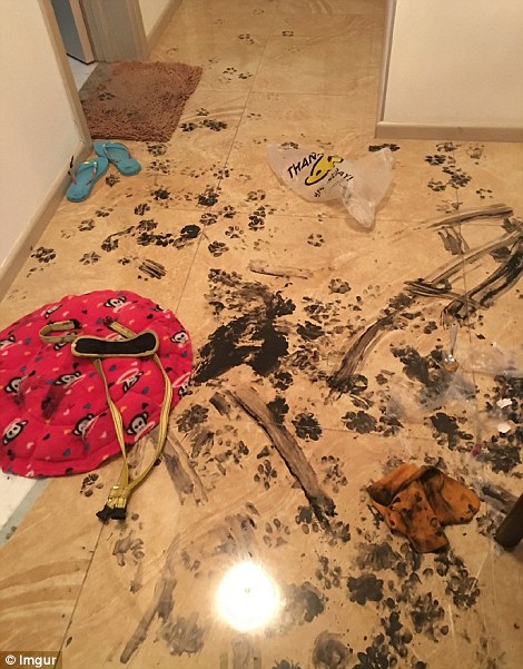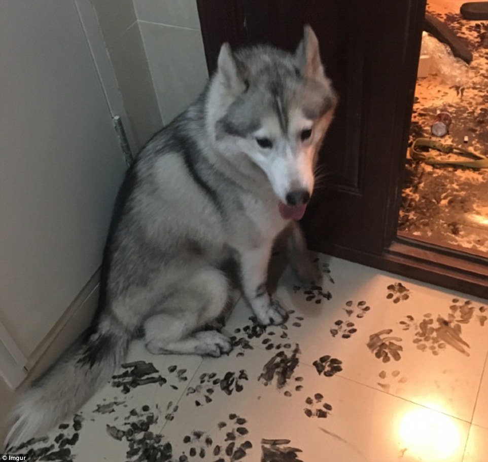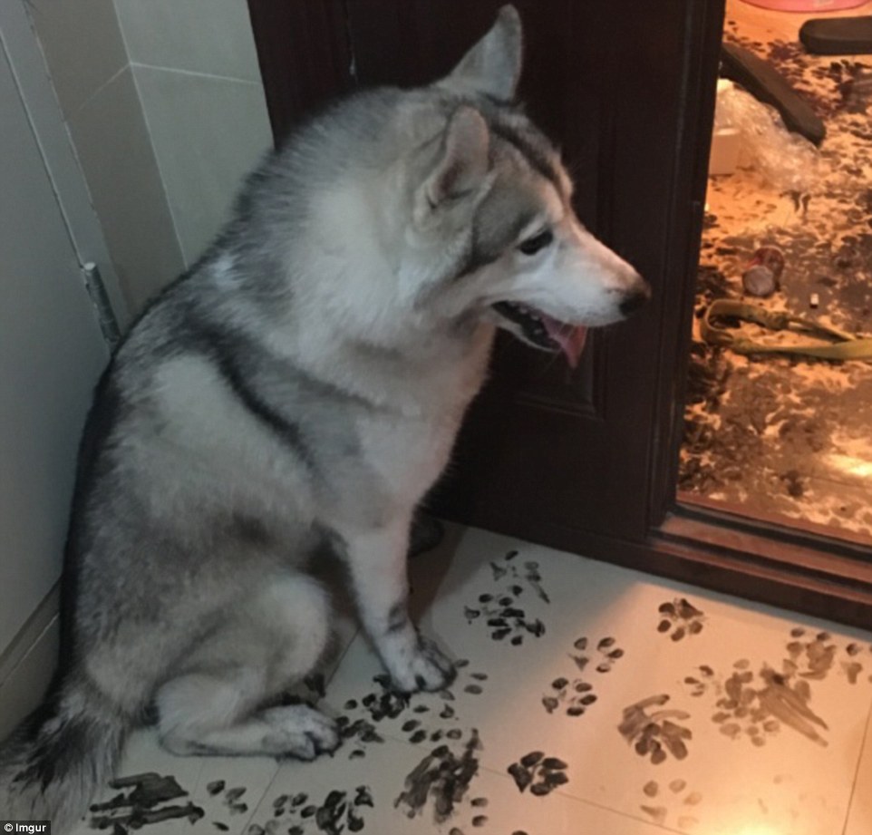 哈士奇或許在書(shū)房里翻到了主人練習(xí)書(shū)法用的墨汁并不小心打翻了,之后沒(méi)心沒(méi)肺的二哈踩著墨汁到處轉(zhuǎn)悠,房子的各個(gè)角落都留下了二哈烏黑的爪印。