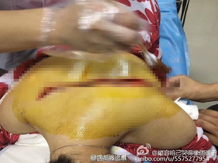 在醫(yī)院治療時,有人幫她拍下一組照片。其中一張,該年輕女子趴在手術(shù)臺,可明顯看到其后頸下方15厘米處,有一條從左手腋窩延生至右肩的傷口,醫(yī)生正對其進行手術(shù)。而另一張圖片,是其傷口縫合后情況,背部有一條如蜈蚣般的傷痕,令人觸目驚心。
