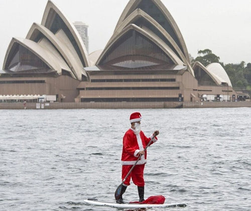 如今圣誕老人出門不單是靠雪橇了,在澳大利亞,這里高能的圣誕老人可以在劃槳板上表演水上漂來慶祝圣誕。據(jù)報(bào)道,澳大利亞當(dāng)?shù)貢r間12月18日,在悉尼港圣誕老人劃槳經(jīng)過P&O郵輪公司的“太平洋寶石號”。由于當(dāng)?shù)赜洼喒I(yè)迅速增長,將有6000名澳大利亞人登上P&O郵輪公司的油輪和圣誕老人一起慶祝圣誕節(jié)來臨。