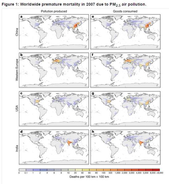 另外,環(huán)環(huán)(ID:huanqiu-com) 發(fā)現(xiàn)這篇研究中提到,中國在全球貿(mào)易中所受到的污染影響更為嚴(yán)重。其中,中國有超過10.86萬人過早死亡與西歐、美國的消費(fèi)相關(guān)聯(lián)。