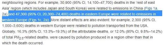 翻譯:東亞其他地區(qū)(包括日本韓國)有3.09萬人的死亡與中國的污染物排放存在關(guān)聯(lián)。(2007年數(shù)據(jù)——環(huán)環(huán)注)