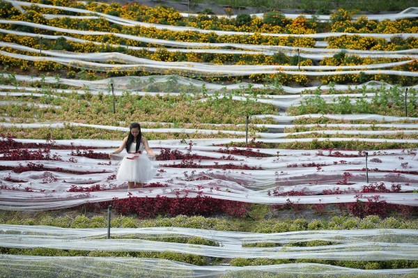 9月24日,為了迎接國慶大假,工作人員在成都一景點內(nèi)擺放一款4100米長的婚紗,該婚紗的拖尾用單層網(wǎng)紗制作而成,寬度1.5米,耗時一個月,大約花費4萬元。成都商報/東方IC