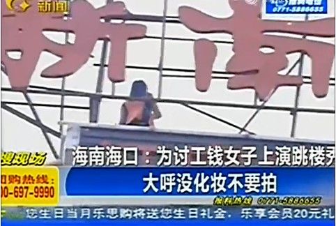 法制晚報:【女子跳樓見記者拍攝:“我沒化妝不要拍”】近日,??谝幻訛橛懝ゅX上演跳樓秀。她坐在大樓樓頂?shù)膹V告牌前,用手抓住廣告牌鐵架,神情激動。警方和救護人員做好準(zhǔn)備隨時出動救援。見到記者拍攝,女子大喊:不要拍了!我今天沒有化妝,不夠漂亮,很難看!