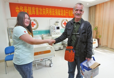 4月18日14時44分,黃發(fā)碧眼的志愿者喬治(英文全名:GeorgesJeanMarianelli),走進河南省腫瘤醫(yī)院造血干細胞采集室,徑直走到病床邊,向正躺在病床上采集造血干細胞的河南姑娘武佳微笑示意,走上前去說“你好”,并為她豎起大拇指。幾分鐘后,病床邊的造血干細胞采集機停止運轉(zhuǎn),這位26歲的河南姑娘捐獻的199毫升造血干細胞混懸液,被醫(yī)護人員小心翼翼地取下……這份飽含河南大愛的“生命種子”,將搭乘飛機,輾轉(zhuǎn)被送到萬里之外的阿根廷,為一名8歲白人兒童送去生命希望。