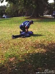 一名目擊導(dǎo)游說:“剛才有兩個客人在悉尼草坪上方便,讓警察看見了。警察追他們,他們提著褲子跑。他們惱羞成怒,要打警察。警察一個過肩摔,把一個男的摔地上骨折了?,F(xiàn)在救護(hù)車,警車都過來了。”