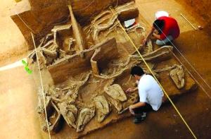考古人員在河南安陽發(fā)現(xiàn)戰(zhàn)國古墓群,這是考古人員在清理一處車馬坑。