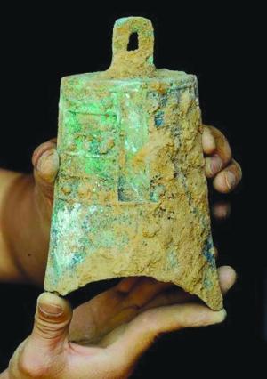 這是考古人員清理出的一組編鐘中的一個。