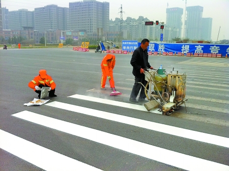 3月29日上午10時(shí)許,在金水東路與東風(fēng)東路交叉口,工人們正在對(duì)該路口的斑馬線重新噴漆(如圖)?!靶聵?biāo)線施劃完5分鐘即可通行”,現(xiàn)場(chǎng)的工人說(shuō)。