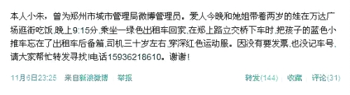 前天23時25分,一位微博名叫“勤行者有志”的網(wǎng)友發(fā)布了一條微博,稱自己是“小朱”,曾為鄭州市城市管理局微博管理員,妻姐把一輛藍色的嬰兒推車落在了出租車后備廂,希望大家?guī)兔ふ摇?/p>