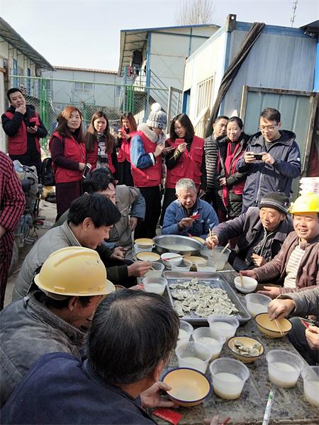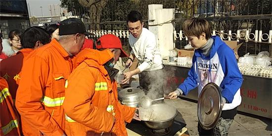 另一邊,在鄭州市花園路廣電南路交叉口,主持人劉雯和韓佳帶著十幾名義工早早的在路邊就開始忙活了。他們要給附近50多名環(huán)衛(wèi)工人煮餃子。平時(shí),環(huán)衛(wèi)工們的午飯都很簡(jiǎn)單,甚至都是隨便對(duì)付的,這次,主持人和義工們特意選在離工人們中午休息比較近的地方,搭起了臨時(shí)的灶臺(tái),給工人們做上一頓熱騰騰的餃子。由于條件簡(jiǎn)陋,臨時(shí)灶臺(tái)上的火十分不穩(wěn)定,劉雯和韓佳脫下厚重的外套,擼起袖子親自生火,費(fèi)了好大勁終于把餃子下鍋了。吃上熱騰騰的餃子,環(huán)衛(wèi)工人們特別開心。一位老大爺由衷的感嘆道:“好久沒吃過這么暖心的午飯了,謝謝你們?!?/p>