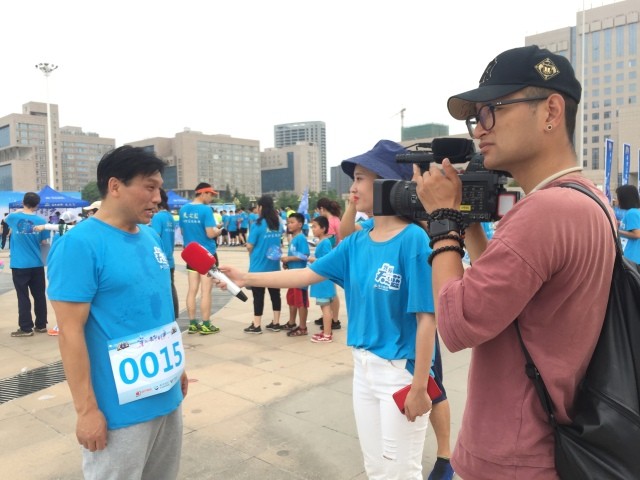 都市頻道主持人劉雯和杜瑞雪開(kāi)跑前與跑者們大合影