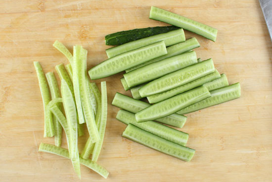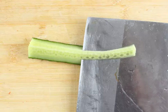 用刀片去中間的軟籽部分切成適度長(zhǎng)短的段
