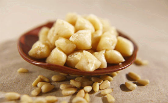 做法:先將白砂糖放入鍋中加少許水,用文火煎熬至粘稠,再加入松子仁,調勻。然后繼續(xù)煎熬,直至用鏟子挑起成絲狀,不粘手時,停火,將糖倒在涂有食用油的盤中,待稍涼,將糖切成小塊,即可食用。
