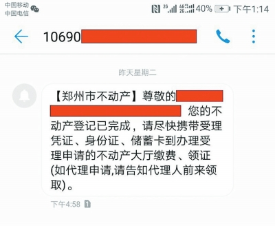 大河報(bào)記者了解到,鄭州市不動(dòng)產(chǎn)登記中心目前正式推出了業(yè)務(wù)辦結(jié)的短信提醒服務(wù)。當(dāng)不動(dòng)產(chǎn)登記部門在辦結(jié)申請(qǐng)人的相關(guān)申請(qǐng)后,便會(huì)給申請(qǐng)人(代理人)發(fā)去短信,提醒其及時(shí)前往不動(dòng)產(chǎn)登記部門領(lǐng)取不動(dòng)產(chǎn)登記證書、證明?!皬臉I(yè)務(wù)辦結(jié)到領(lǐng)證還有一些內(nèi)部流轉(zhuǎn)程序,一般情況下,我們都是在繕證完成后24小時(shí)發(fā)送短信?!毕嚓P(guān)負(fù)責(zé)人介紹說。