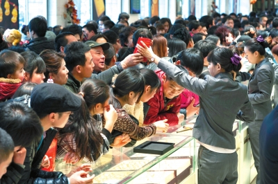 昨天,市民在菜百挑選黃金飾品。當(dāng)天是新年第一天,北京各大金店出現(xiàn)消費(fèi)者囤金迎新的火爆場(chǎng)景。其中,菜百各分店全天銷(xiāo)售額達(dá)到兩億元;中國(guó)黃金蔣宅口旗艦店投資金銷(xiāo)售超過(guò)150公斤。京華時(shí)報(bào)記者蒲東峰攝